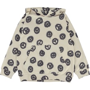 Ratata is een kakikleurige hoodie met een print van een peace teken en smileys. De hoodie heeft een buidelzak en ribboord aan de mouwen en onderkant.