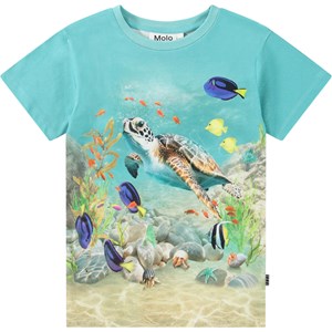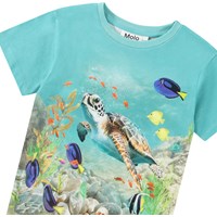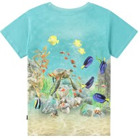 Turquoise t-shirt van biologisch katoen met korte mouwen en ribboord rond de hals. Het t-shirt heeft een ruimvallende pasvorm en een print van een kleurrijke koraalrif met vissen en zeeschildpadden.