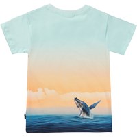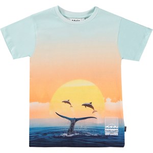 T-shirt van 100% biologisch katoen met een print in blauw en oranje tinten. Op de print staat een zonsondergang boven de oceaan, waarbij de staart van een walvis een lachend gezicht vormt met behulp van twee speelse dolfijnen. De print loopt door op de achterkant en toont een bultrug walvis die in de golven duikt. Het t-shirt heeft een ronde hals met ribboord en een normale pasvorm.