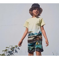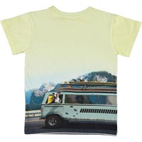Op het dak van een auto zijn surfplanken gemonteerd en alles is klaar voor de vakantie op het lichtgele Raul t-shirt. Als je mee wilt doen aan dit avontuur, stap dan gewoon in. Het t-shirt is van 100% katoen en heeft oprolbare mouwen.
