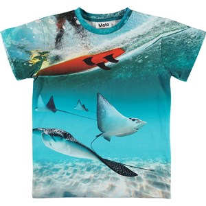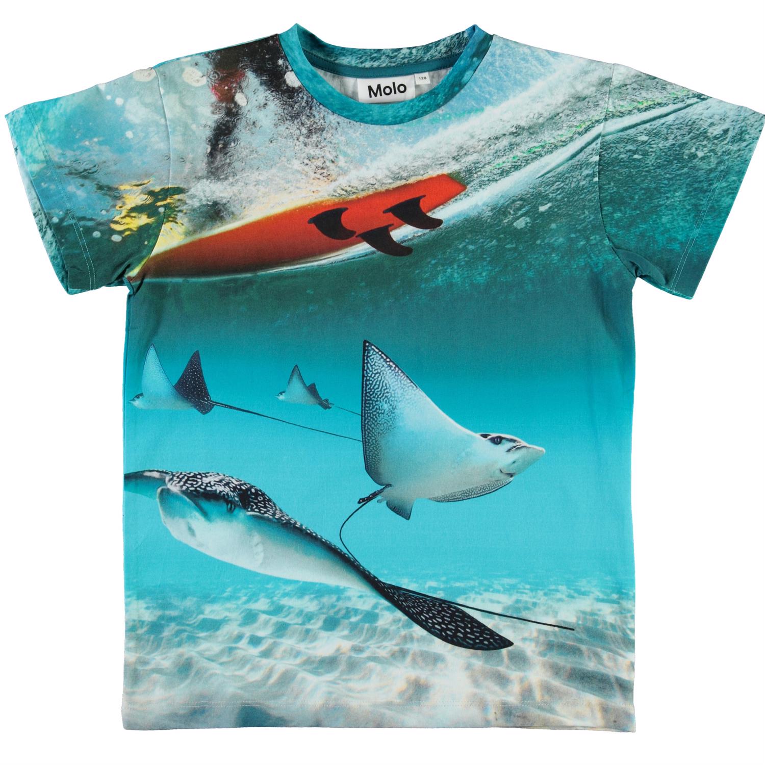 Duik onder het blauwe oppervlak van de oceaan en kijk naar de pijlstaartroggen op het Raul t-shirt. Het t-shirt is van 100% katoen en heeft oprolbare mouwen.