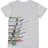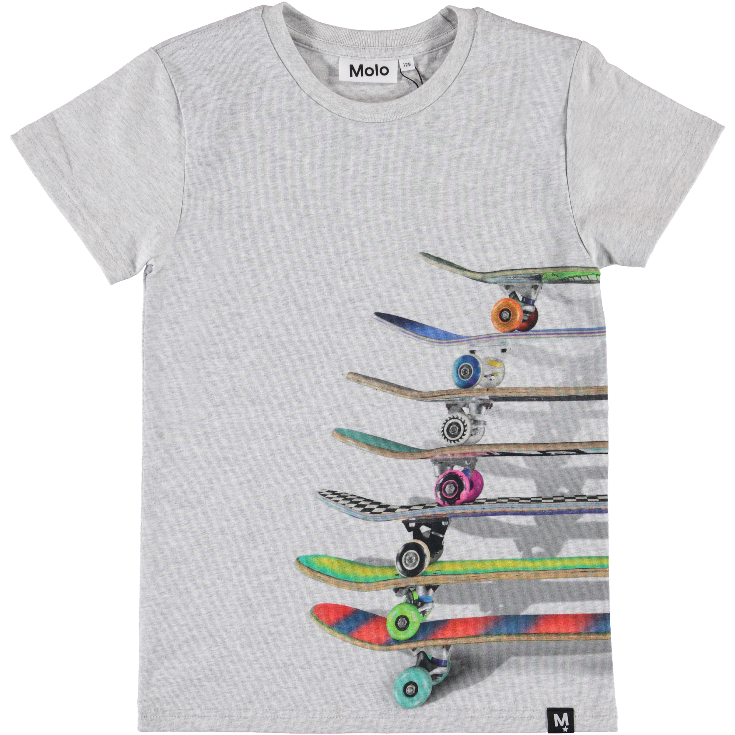 Het grijze Raven t-shirt toont een stapel kleurrijke skateboards. Raven is van 100% katoen en heeft korte mouwen.