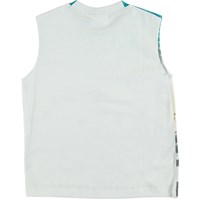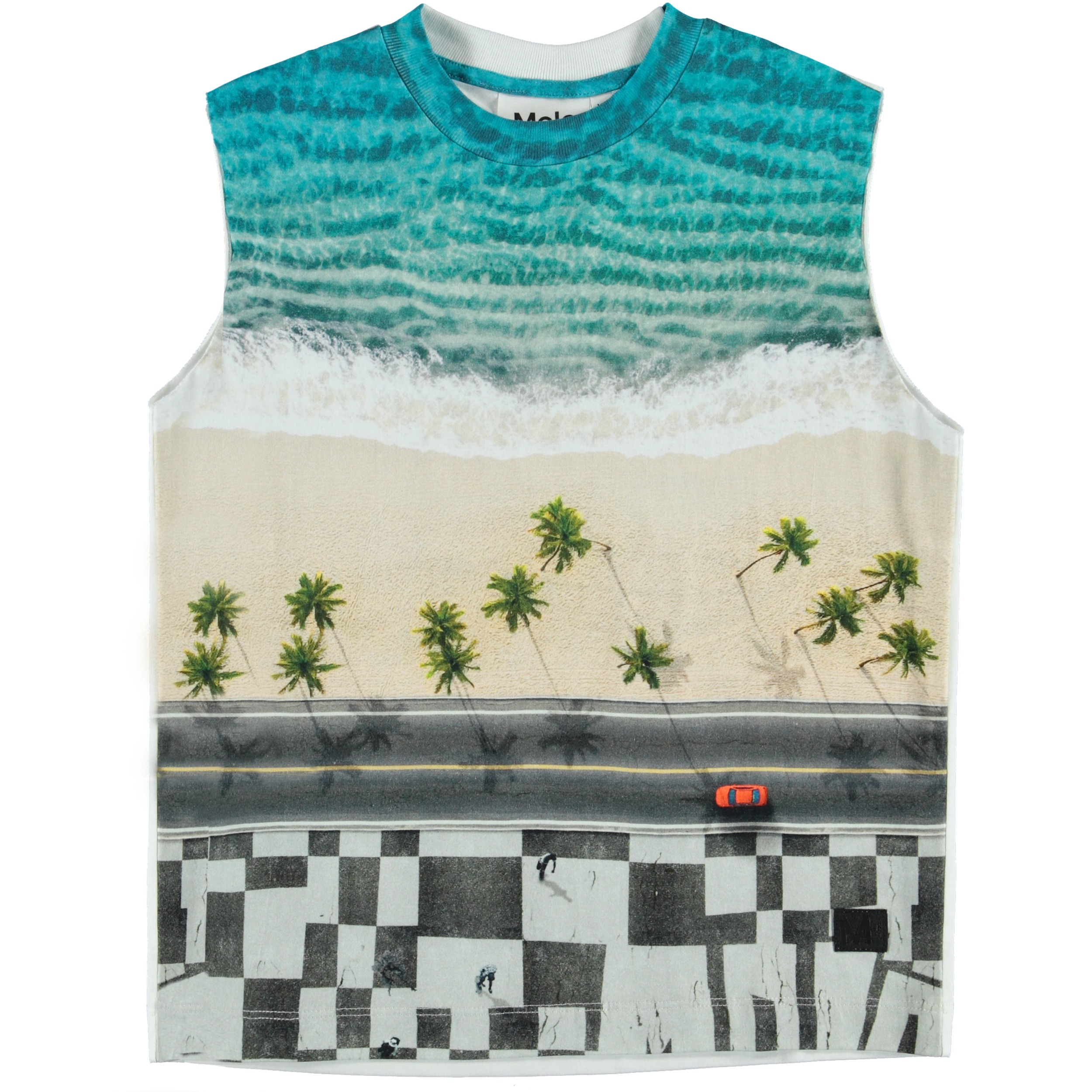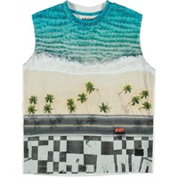 Droom weg met afbeeldingen van blauwe golven en palmbomen aan de kust op de Ray tanktop. Het is een zomerklassieker die je nooit beu zult worden.