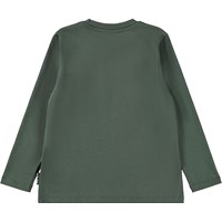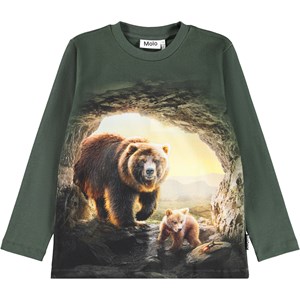 Donkergroene longsleeve gemaakt van zacht biologisch katoen met een ribboord rond de hals. De longsleeve heeft een ruimvallende pasvorm en op de voorkant een print van een berenmoeder en haar jong in een grot.