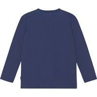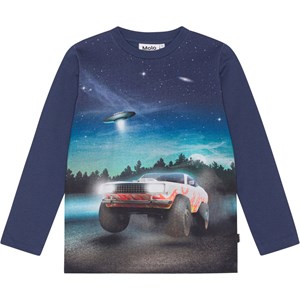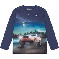 Donkerblauw shirt met lange mouwen van biologisch katoenen jersey. Het heeft een ronde hals en een normale tot ruime pasvorm. Het shirt heeft een print van een donkere nacht, een snelle auto met vlammen en een vliegende UFO op de achtergrond.
