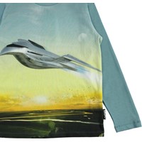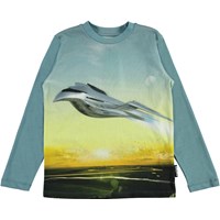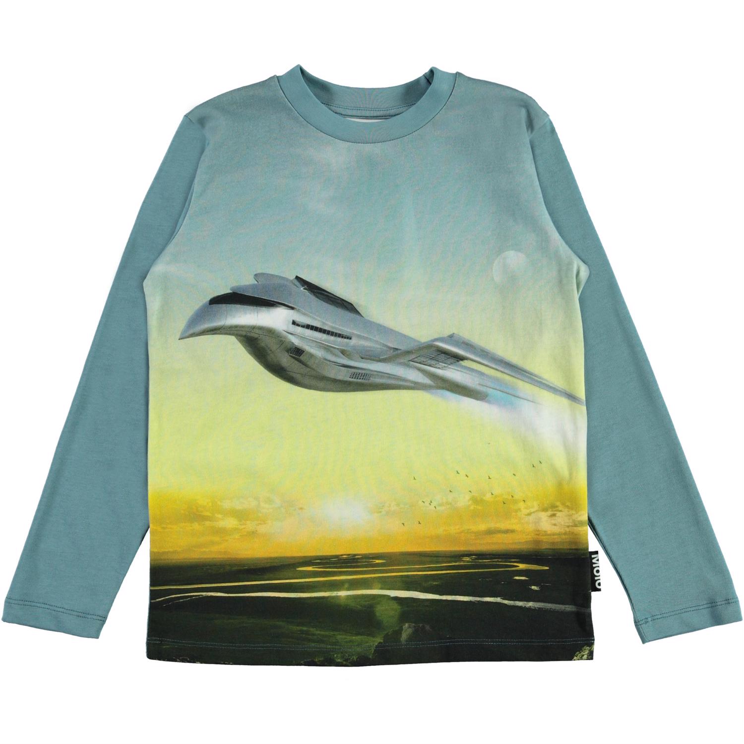 Reif is een blauwe shirt met lange mouwen en een print van een futuristisch vliegtuig op de voorkant.
