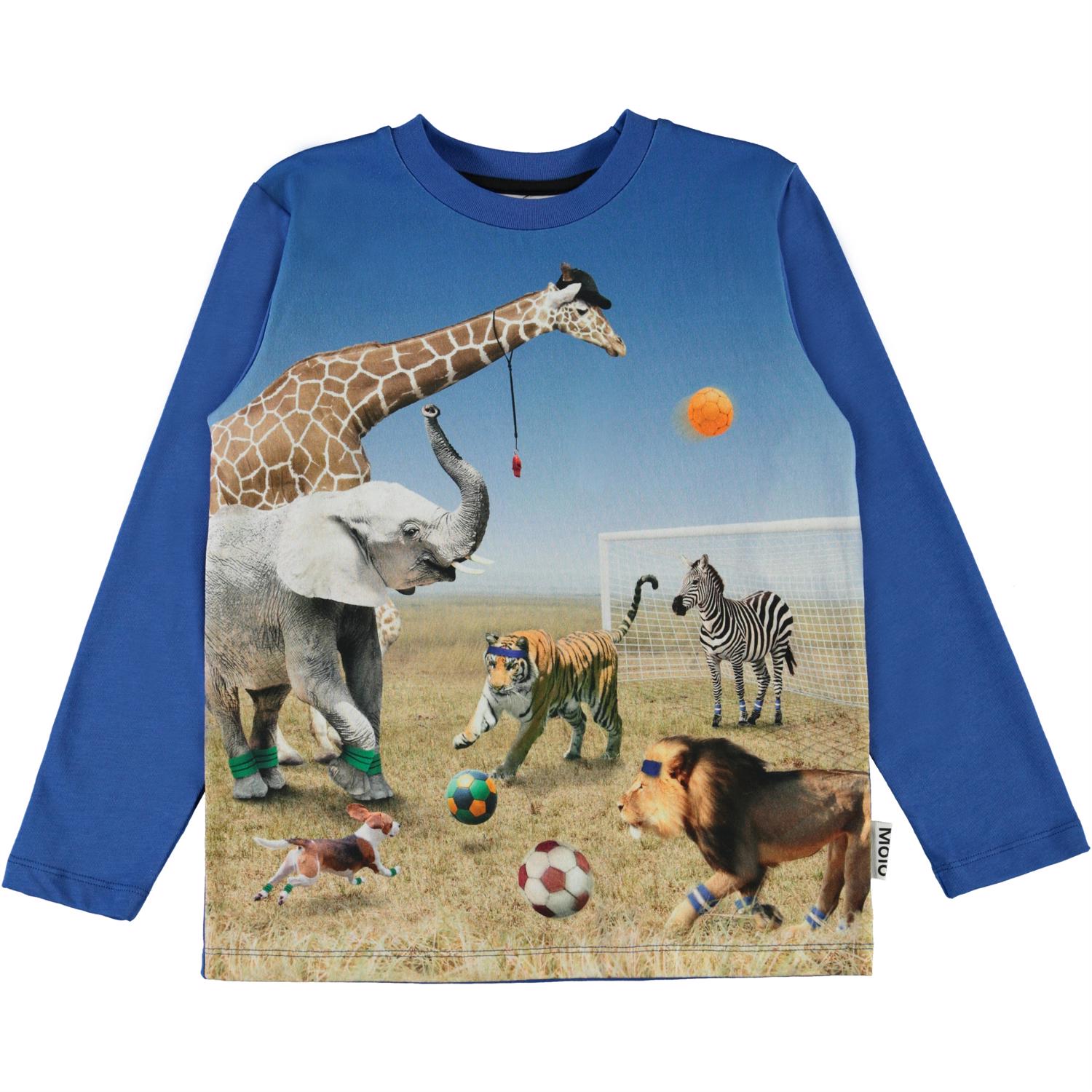 Doe mee met de dieren van de savanne in een voetbalwedstrijd op het Reif shirt. De giraf heeft het perfecte overzicht en is daarmee de scheids. Het shirt heeft lange blauwe mouwen en een ronde hals.