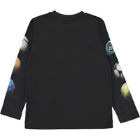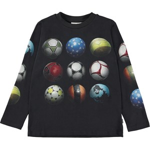 Reif is een zwarte longsleeve met op de voorkant een print van kleurrijke voetballen.