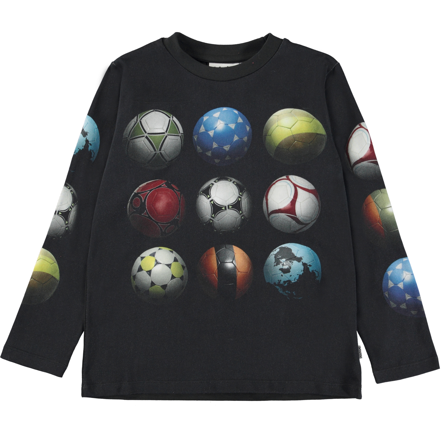 Reif is een zwarte longsleeve met op de voorkant een print van kleurrijke voetballen.
