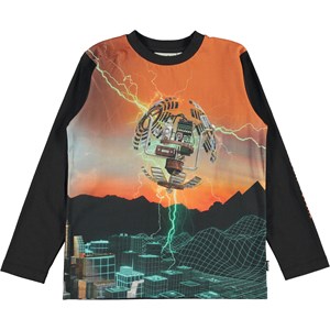 Reif is een zwart shirt met lange mouwen met een tijdmachine op de voorkant en een tekst op één mouw.