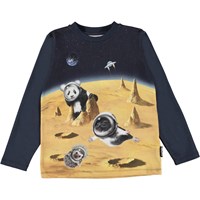 Reif is een donkerblauwe biologische longsleeve met een print van verschillende dieren die in de ruimte zijn gelanceerd.