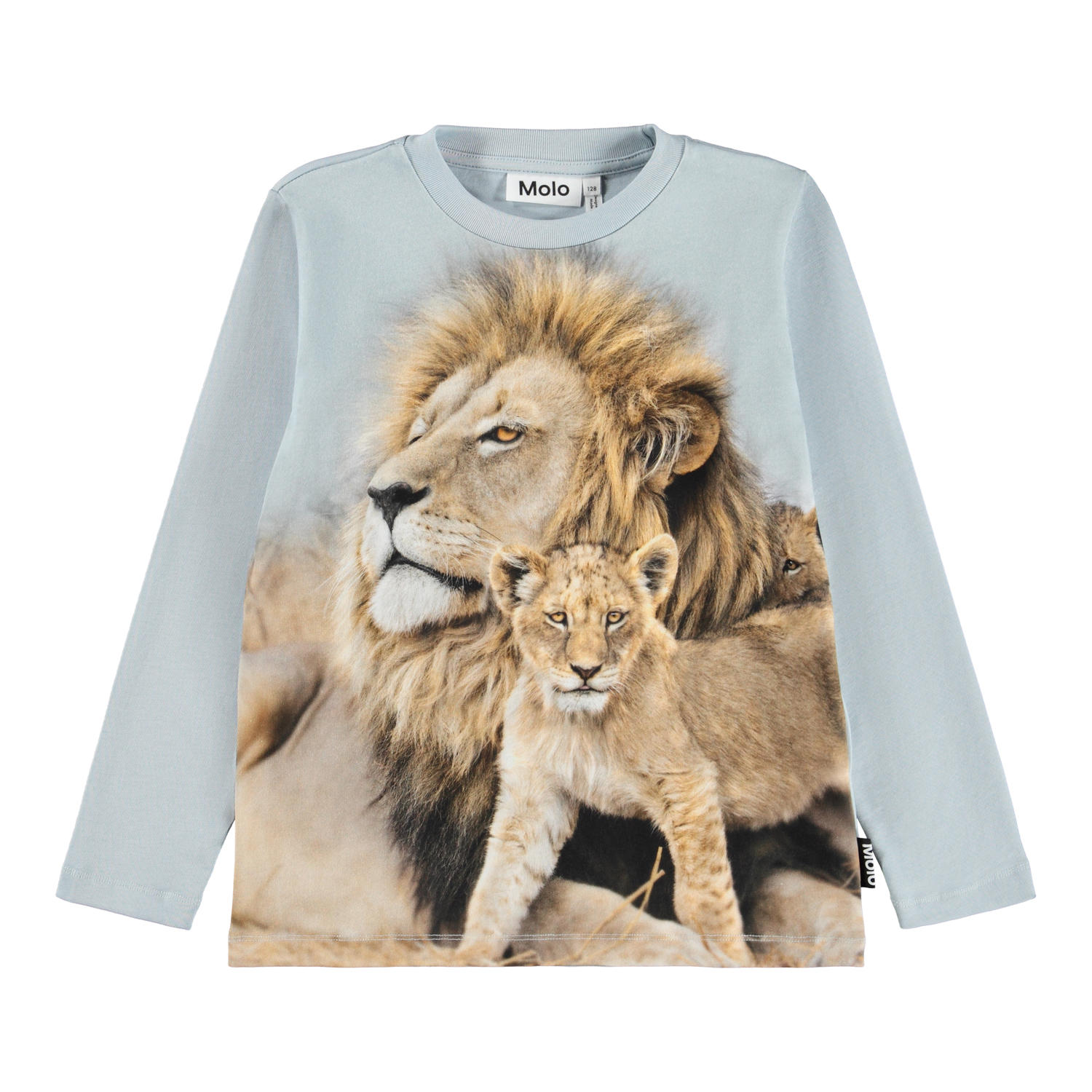 Lichtblauwe longsleeve gemaakt van zacht biologisch katoen met een ribboord rond de hals. De longsleeve heeft een ruimvallende pasvorm en op de voorkant een print van een leeuwenfamilie.