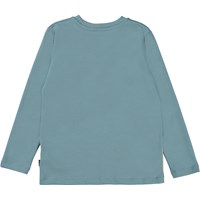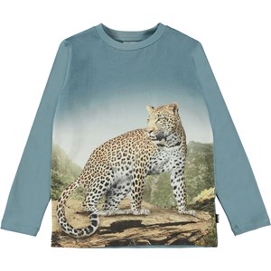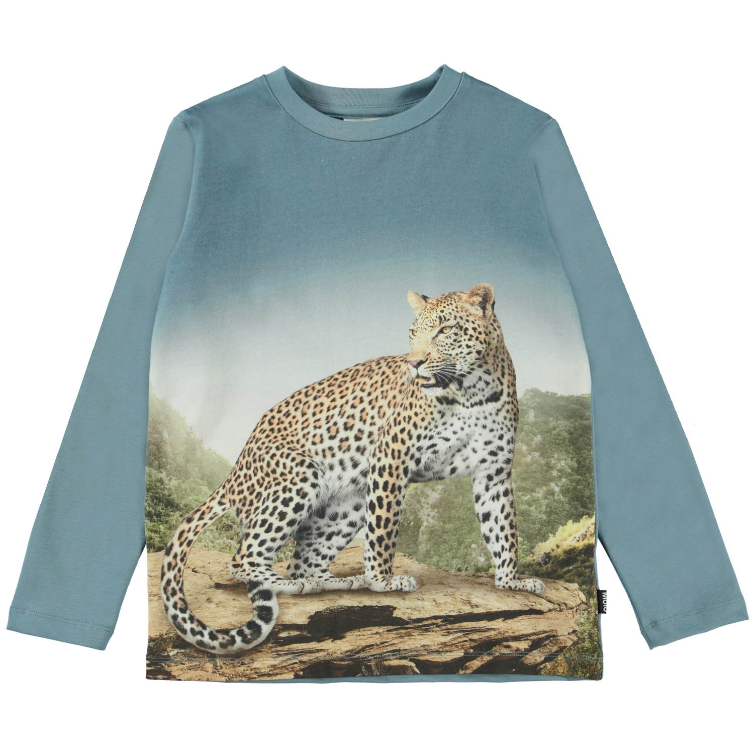 Reif is een blauw t-shirt met lange mouwen en een print van een bergluipaard die op een klif staat. Het t-shirt heeft ribboord rond de hals en mouwen.