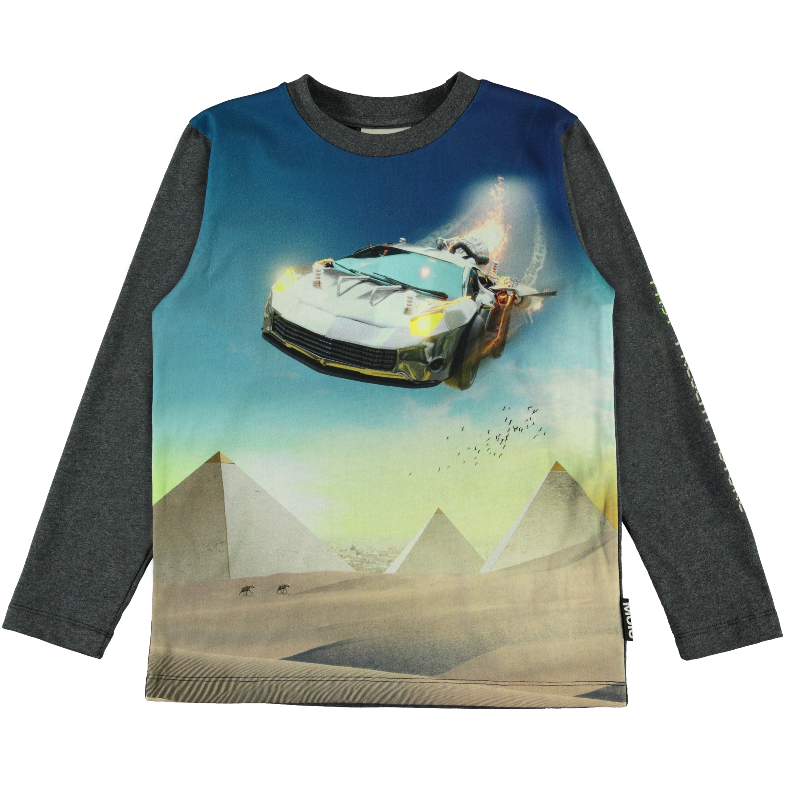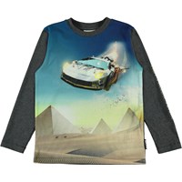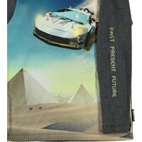 Reif is een donkergrijs shirt met een tijdreizende auto uit de toekomst op de voorkant en een tekst op één mouw.