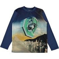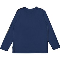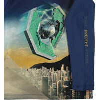 Reif is een donkerblauw shirt met een tijdmachine op de voorkant en een tekst op één mouw.