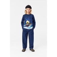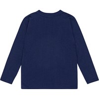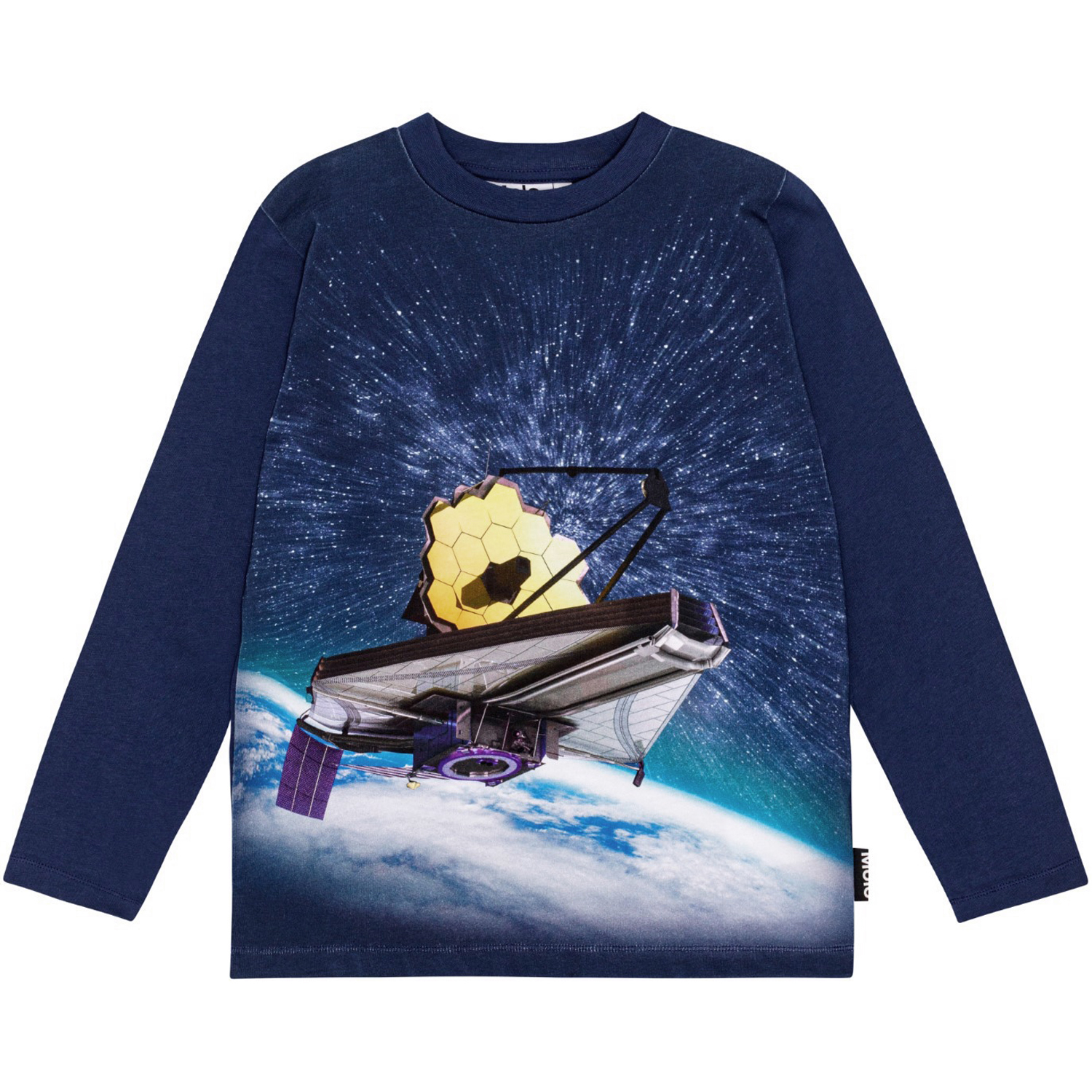 Donkerblauwe longsleeve van biologisch katoen met ronde hals en geribbelde zoom. Het heeft een normale pasvorm en een print op de voorkant, geïnspireerd door de grote James Webb-ruimtetelescoop. De print toont een telescoop in de ruimte met sterren en een glimp van de aarde erachter. Stel je eens voor welke beelden hij naar de aarde kan sturen.