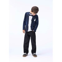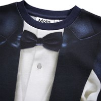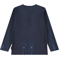 Donkerblauw longsleeve gemaakt van zacht biologisch katoen met een ribboord rond de hals. De longsleeve heeft een ruimvallende pasvorm met een illusieprint van een smoking.