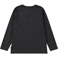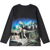 Zwarte biologische katoenen longsleeve met een ronde hals en geribbelde zoom. Het heeft een normale pasvorm en een print op de voorkant, waar verleden en toekomst samensmelten met een robotdinosaurus en zijn vrienden die bij het tankstation samenkomen voor een leuke avond.