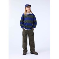 Wijd gestreept blauw en donkergroen rugbyshirt gemaakt van zacht biologisch katoen. Het shirt heeft een normale pasvorm, lange mouwen met ribboorden, een witte kraag en een kleine knoopsluiting met drie verborgen knopen, waardoor het gemakkelijk aan te trekken is.
