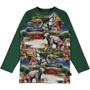 Remington is een groene raglan shirt met lange mouwen. Het shirt heeft een print van een prehistorische wereld en dieren in prachtige groene en rode kleuren.