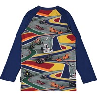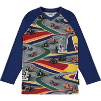 Remino is een blauwe trui met lange raglanmouwen en met een print van kleurrijke raceauto's op de voor- en achterkant. De trui heeft een kleine v-hals.