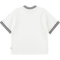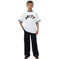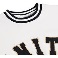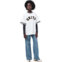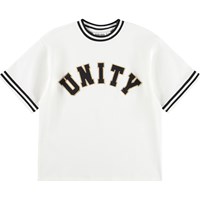 Wit T-shirt met een ronde hals en gestreepte boord rond de hals en mouwen. Het T-shirt heeft een ruimvallende pasvorm met een sportieve, klassieke uitstraling en de tekst Unity op de voorkant.