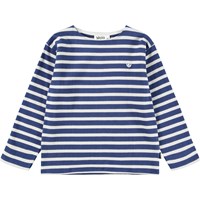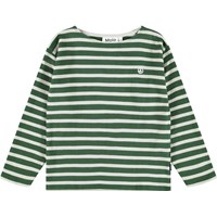 Gestreepte groen en gebroken witte longsleeve gemaakt van zacht biologisch katoen met een gevoerde kraag. De longsleeve heeft een ruimvallende pasvorm met een klein geborduurd vredessymbool op de borst.
