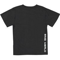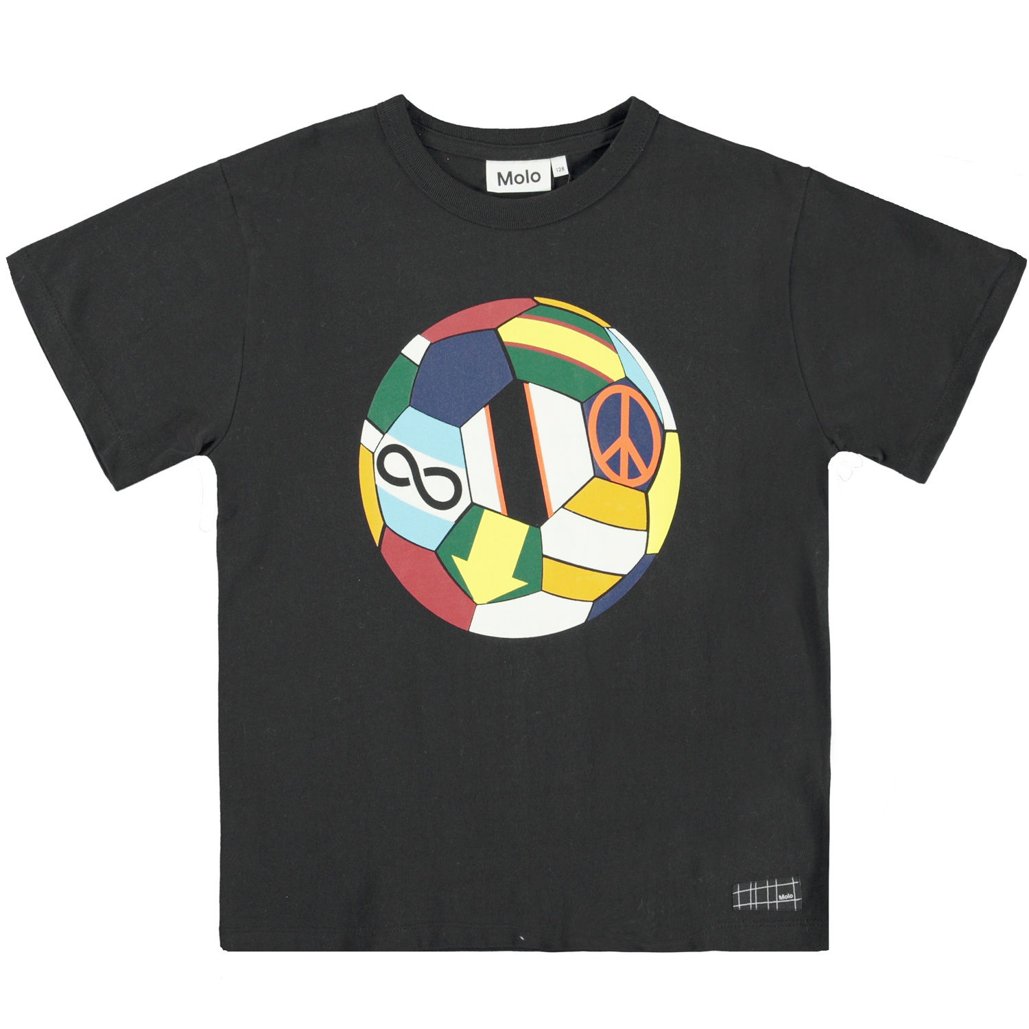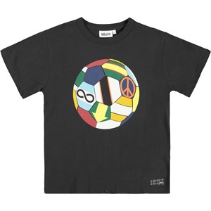 Riley is een zwart t-shirt met een print van kleurrijke voetballen op de voorkant.