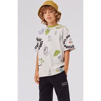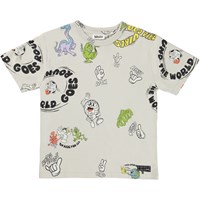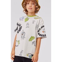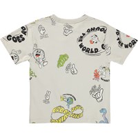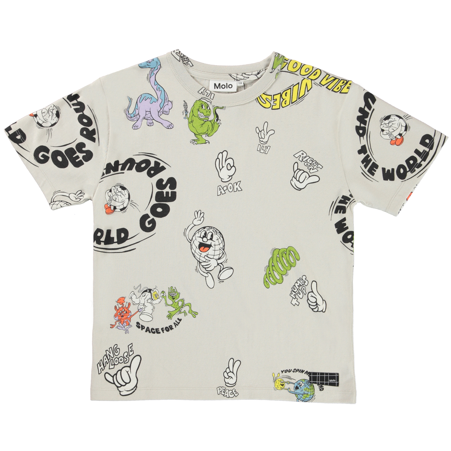 Riley is een beige-grijs t-shirt met een print van verschillende grappige figuren, handgebaren en tekst.