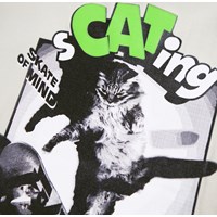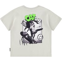 Beige t-shirt gemaakt van zacht biologisch katoen met een ribboord rond de hals. Het t-shirt heeft een ruimvallende pasvorm met een print van een kat op een skateboard en de tekst "sCATing, skate of mind".