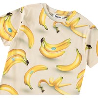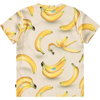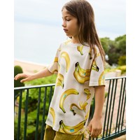 Beige t-shirt van zacht biologisch katoen met korte mouwen en ribboord rond de hals. Het t-shirt heeft een ruimvallende pasvorm met een all over print van gele bananen.