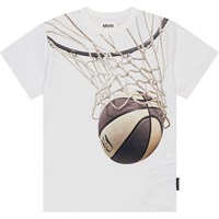 Riley is een wit t-shirt van 100% biologisch katoen. De print op de voorkant is een simpele foto op een witte achtergrond met een klassieke zwart/witte basketbal die net aan het eind van de wedstrijd het winnende punt scoort. Swoosh! Riley heeft een ronde hals met ribboord en een ruimvallende pasvorm.