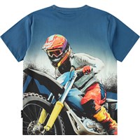 Blauw t-shirt van zacht biologisch katoen met korte mouwen en ribboord rond de hals. Het t-shirt heeft een ruimvallende pasvorm en op de voor- en achterkant een print van een motorcrosser.