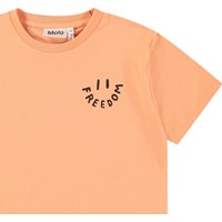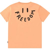 Oranje t-shirt van zacht biologisch katoen met korte mouwen en ribboord rond de hals. Het t-shirt heeft een ruimvallende pasvorm met op de voor- en achter kant een print van een smiley waarbij de mond het woord 'Freedom' vormt.