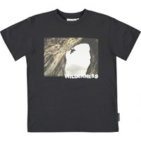 Riley is een bruin t-shirt met een bergbeklimmer dat aan een klif hangt.