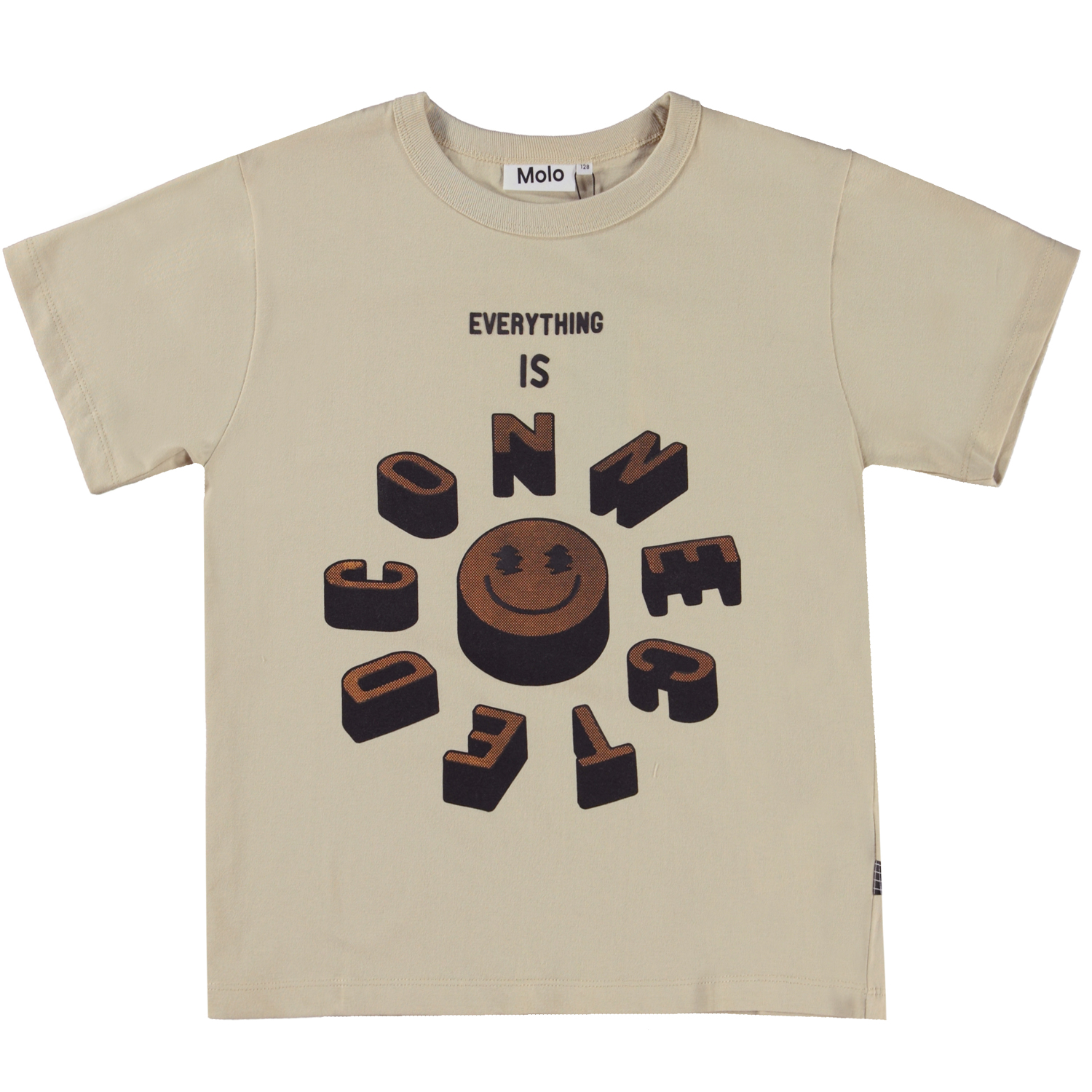 Beige t-shirt met op de voorkant een grafische print in het bruin en zwart. De print brengt de boodschap over dat we allemaal verbonden zijn. Dit t-shirt is gemaakt van 100% katoen, heeft korte mouwen, een ronde hals met rib en een ruimvallende pasvorm.