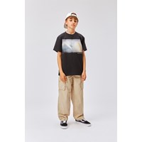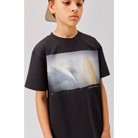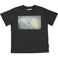 Riley is een zwart t-shirt met een print van een foto die de regenboog in de lucht weergeeft.
