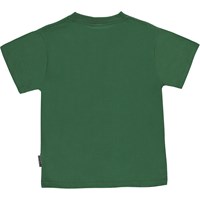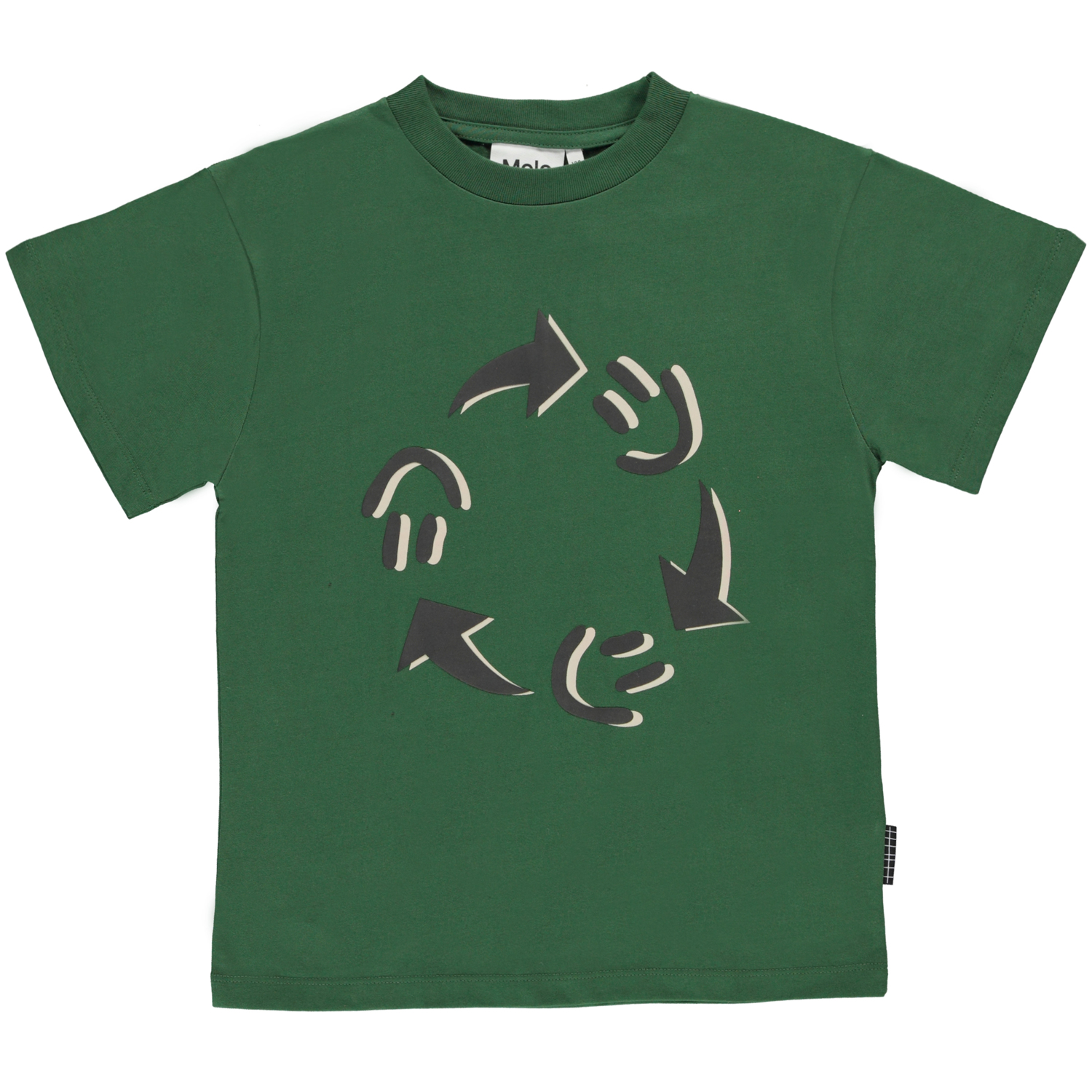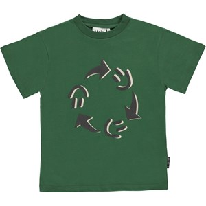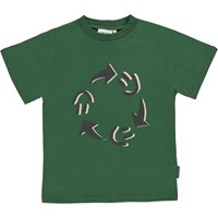 Riley is een donkergroen t-shirt met op de voorkant een print van smileys die rond gaan in een cirkel.