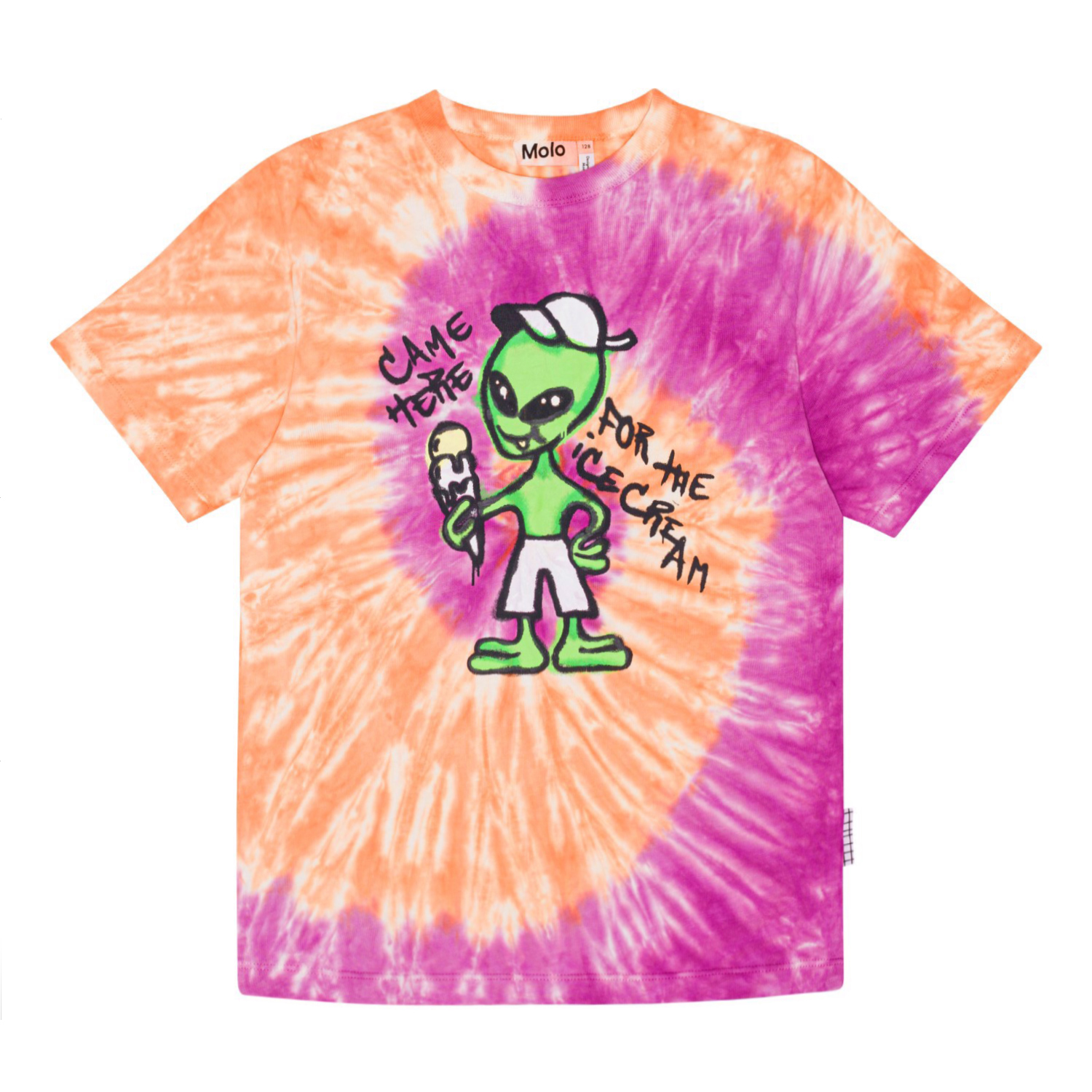 Riley is een t-shirt met tie-dye print van 100% biologisch katoen. De t-shirt is in oranje en paarsroze tie-dye twister print met op de voorkant een tevreden toeristische buitenaardse wezen die heeft waarvoor hij gekomen was: een ijsje! Riley heeft een ronde hals met ribboord en een ruimvallende pasvorm. Molo's tie-dye print is uniek en handgemaakt, dit houdt in dat de print kan verschillen.