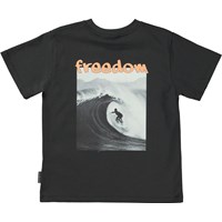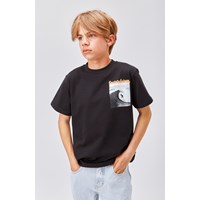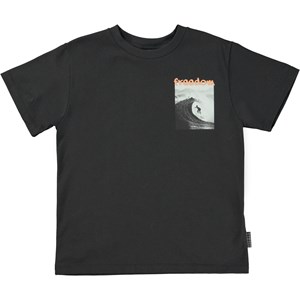 Riley is een zwart t-shirt van biologisch katoen met een kleine zwart/witte surfer print op de borst en een grote surfer print midden op de achterkant.