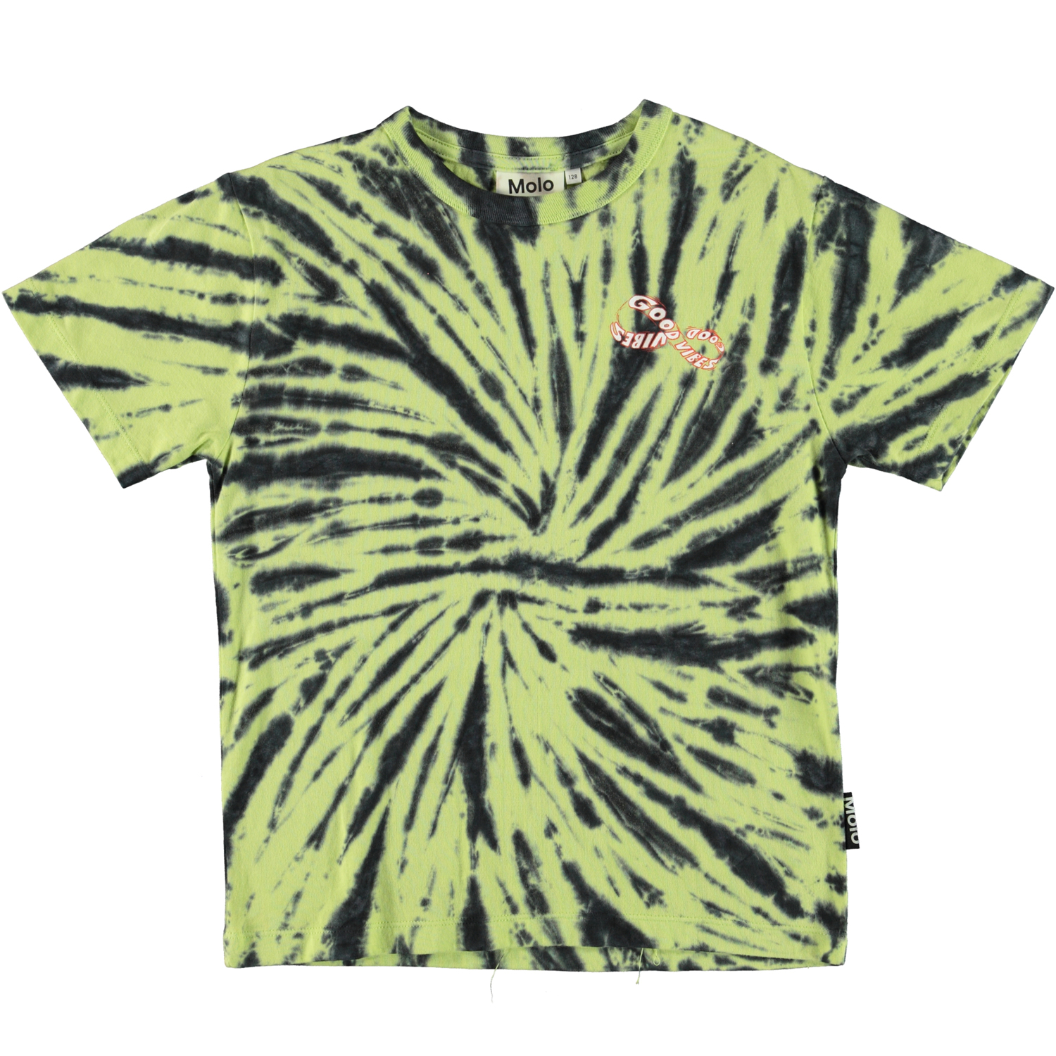 Riley is een t-shirt met een groen zwarte tie-dye print die een mooie spiraal creëert.