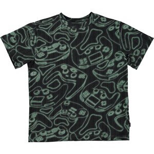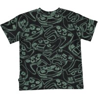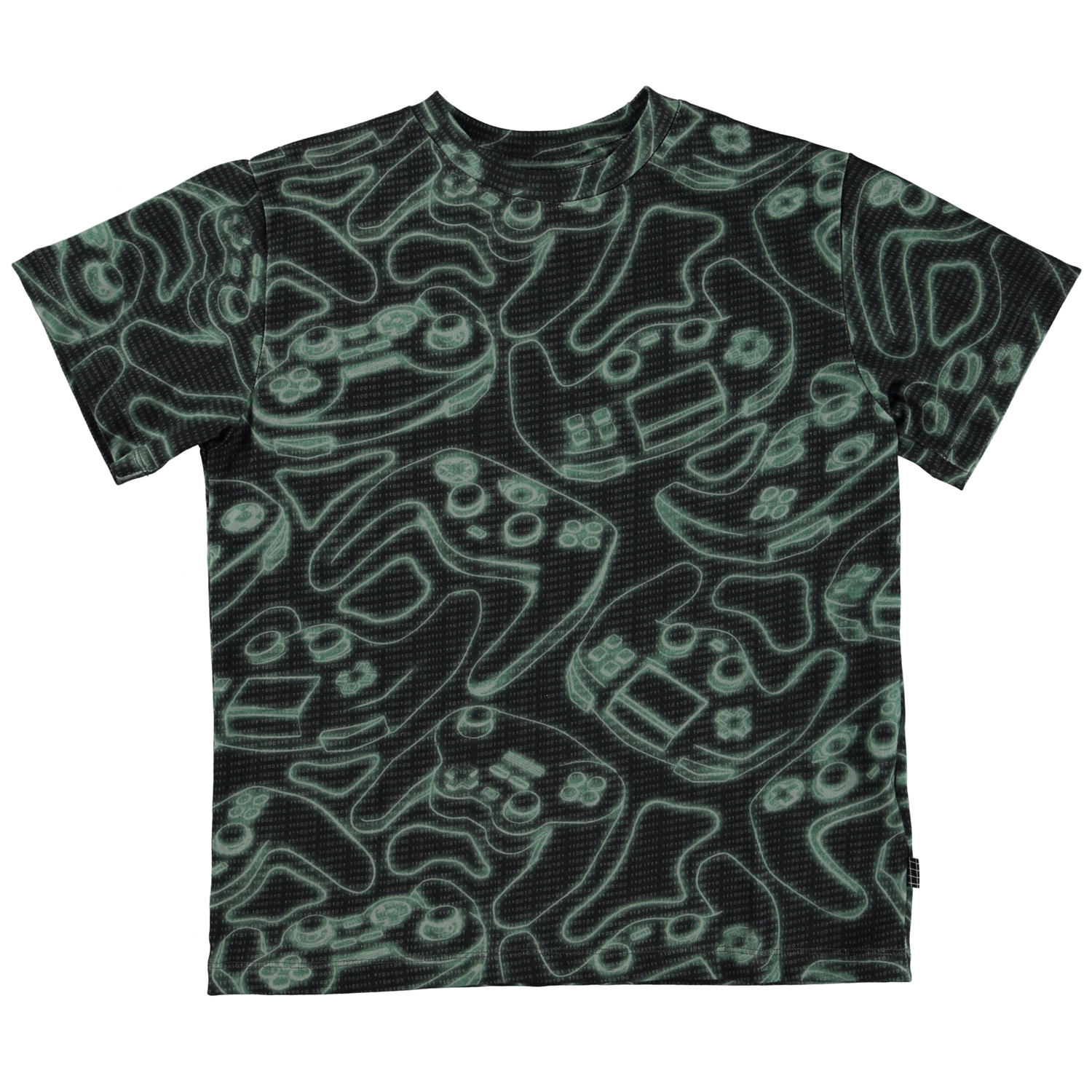 Zwart t-shirt met een groene print. Op de print zijn veel game controllers te zien die oplichten in het donker. Op de achtergrond staat “Freedom”, geschreven als computercode. Dit t-shirt is gemaakt van 100% katoen, heeft korte mouwen, een ronde hals met rib en een ruimvallende pasvorm.
