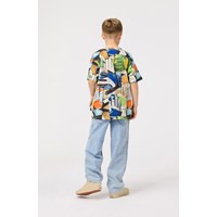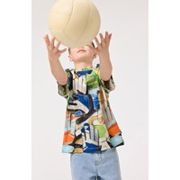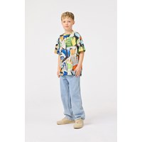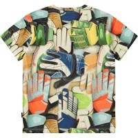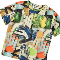 T-shirt van zacht biologisch katoen met korte mouwen en ribboord rond de hals. Het t-shirt heeft een ruimvallende pasvorm met een all over print van kleurrijke voetbalhandschoenen.