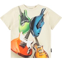 Beige T-shirt gemaakt van zachte biologische katoen met een ribboord rond de hals. Het T-shirt heeft een ruimvallende pasvorm met een print van kleurrije rockgitaren.