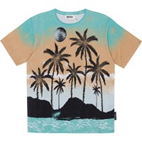 Riley is een t-shirt van 100% biologisch katoen met een print. De print is een klassiek Hawai motief in zwarte, turquoise en zandtinten met palmbomen en een zonsondergang. Dit t-shirt heeft een ronde hals met ribboord en een ruimvallende pasvorm.