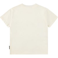 Beige T-shirt gemaakt van zachte biologische katoen met een ribboord rond de hals. Het T-shirt heeft een ruimvallende pasvorm met een print van dinosaurussen.