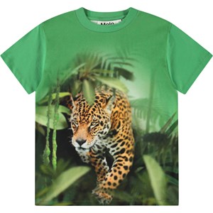 Groen t-shirt van zacht biologisch katoen met korte mouwen en ribboord rond de hals. Het t-shirt heeft een ruimvallende pasvorm met een print van een cheeta in de jungle, die doorloopt op de achterkant met een zwarte cheeta op de loer.