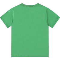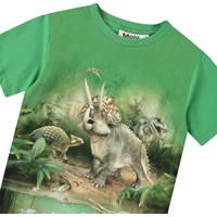 Groen t-shirt van zacht biologisch katoen met korte mouwen en ribboord rond de hals. Het t-shirt heeft een ruimvallende pasvorm met op de voorkant een print van dinosaurussen in de wilde natuur.