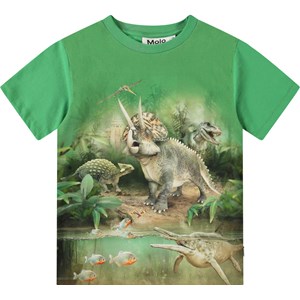 Groen t-shirt van zacht biologisch katoen met korte mouwen en ribboord rond de hals. Het t-shirt heeft een ruimvallende pasvorm met op de voorkant een print van dinosaurussen in de wilde natuur.