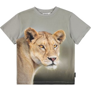 Kaki t-shirt gemaakt van zacht biologisch katoen met een ribboord rond de hals. Het t-shirt heeft een ruimvallende pasvorm met een print van een close-up van een leeuw in gouden kleuren.